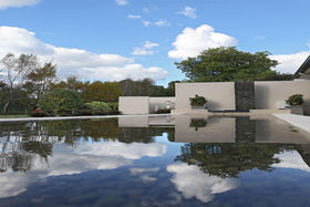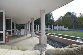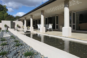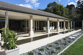 A serene water feature stretching the length of the front of the house creates this tranquil vibe with its tinkling background music. The shadows it creates dance on the ceiling above the vast sheltered veranda and outdoor entertaining area across the front of the home.