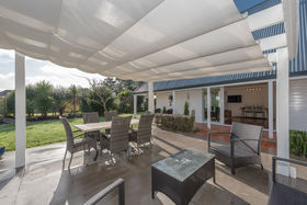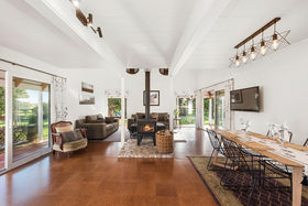 Demarking the dwelling as that of a dedicated entertainer, open-concept living zones pivot from a well-equipped timber kitchen facing into communal areas with choices of covered or exposed patios for all-weather get-togethers. Modern decor works with high-studs and plentiful glazing to infuse interiors with natural warmth and abundant light.