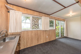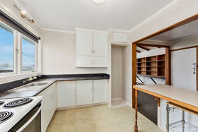 The open plan dining flows into the original kitchen with good bench space, storage and light.