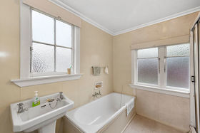 The bathroom has a separate shower and bath as well as having a separate laundry room.
