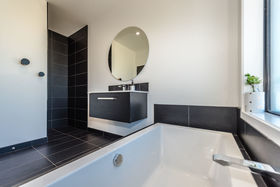 The master constitutes a private sanctuary in a semi-separate wing well away from primary living spaces with the touch of luxury of his/her vanities and a large shower executed in stylish black ceramics.